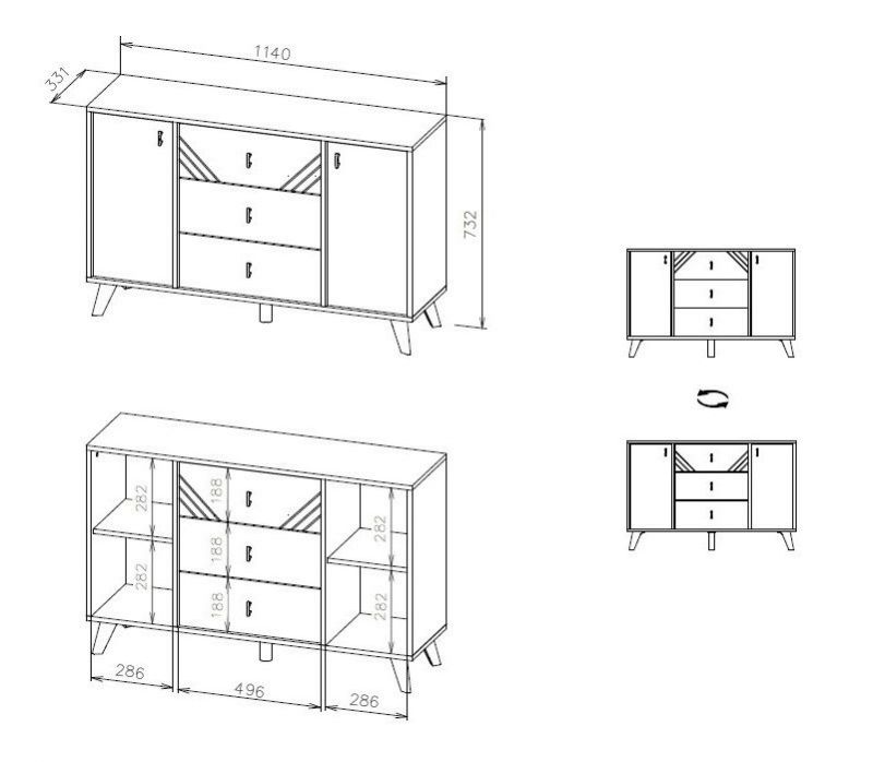 Комод двухстворчатый с тремя выкатными ящиками на шариковых направляющих.