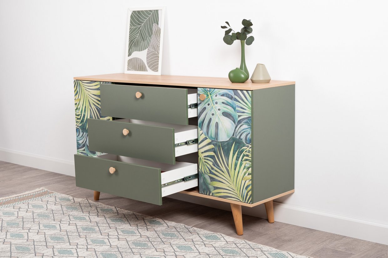 Маттиас – яркий комод с фотопечатью в тропическом стиле. Деревянные ручки и опоры подчеркивают естественность дизайна, а шариковые направляющие полного выдвижения и петли с доводчиком обеспечивают плавность и удобство эксплуатации.