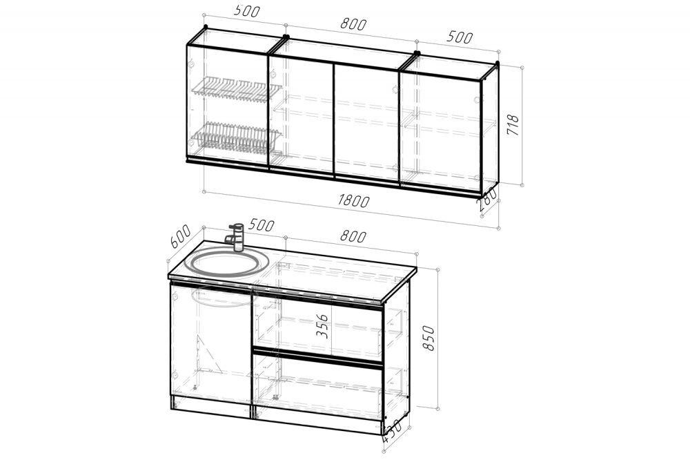 Ширина: 1800 мм; Глубина: 600 мм (со столешницей)