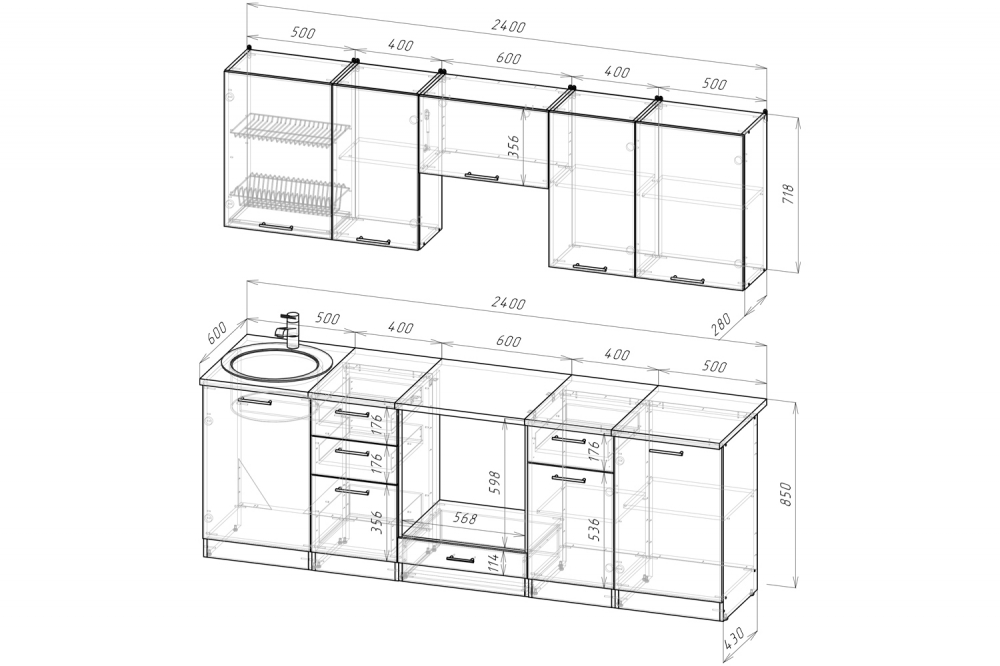 Ширина: 2400 мм; Глубина: 600 мм (со столешницей)