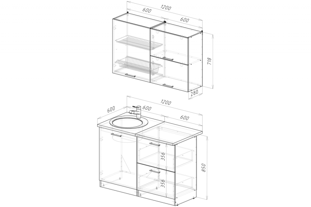 Ширина: 1200 мм; Глубина: 600 мм (со столешницей)