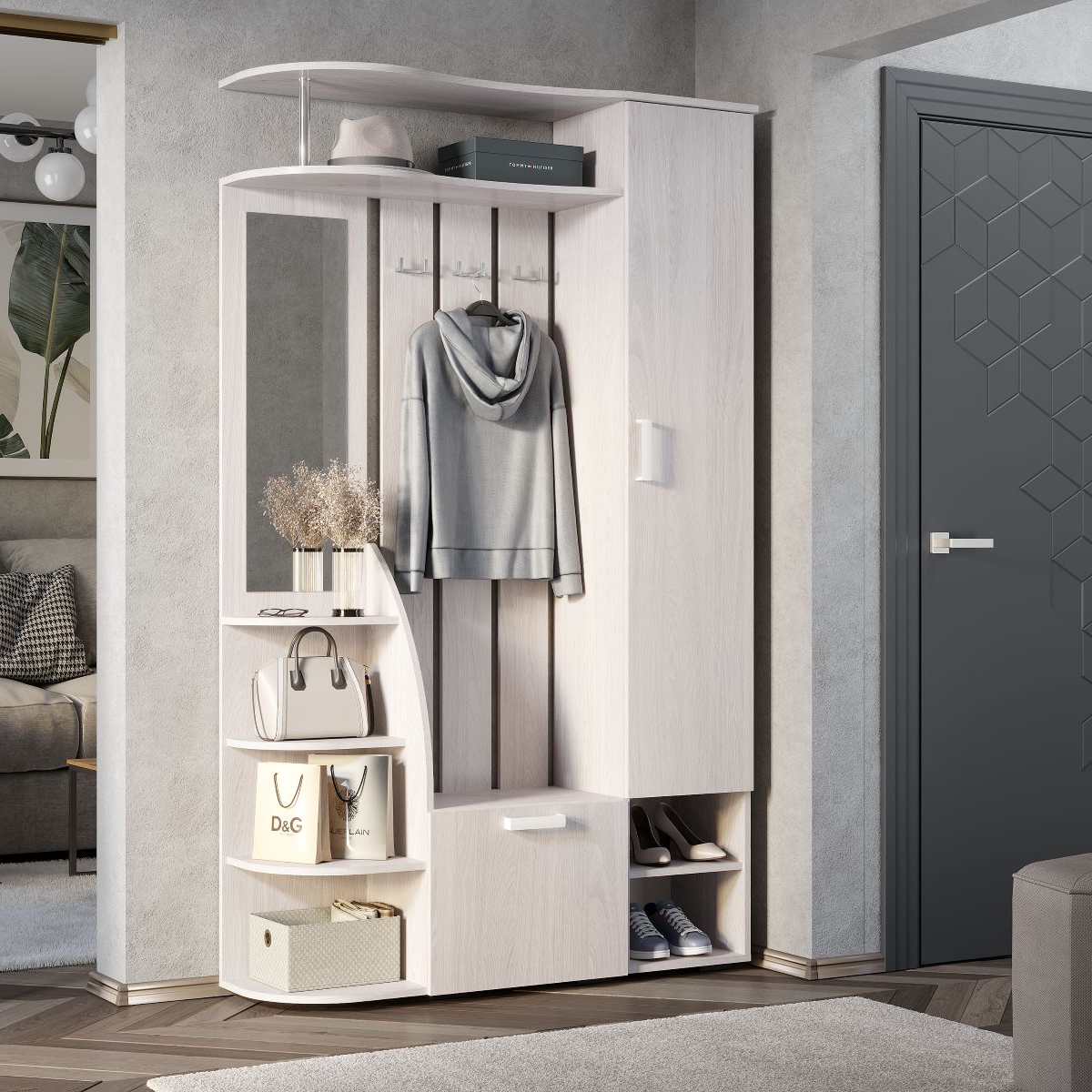 Прихожая «Анора» – это модель, выполненная в нежном оттенке «ясень белый». Лаконичный дизайн с мягкими линиями делает её идеальным решением для современного дома. Белоснежные ручки на дверцах легко ложатся в руку и облегчают ежедневное использование прихожей. В «Анора» предусмотрены все нужные зоны для хранения: боковые открытые полки для повседневной обуви, закрытый ящик для сезонной, а также полки для головных уборов и шкаф для верхней одежды.