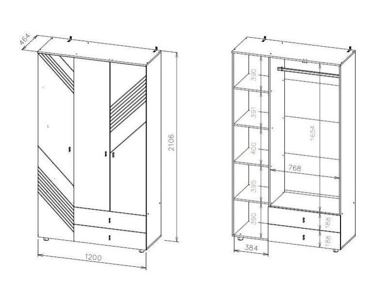Шкаф распашной трехстворчатый с двумя ящиками на шариковых направляющих.