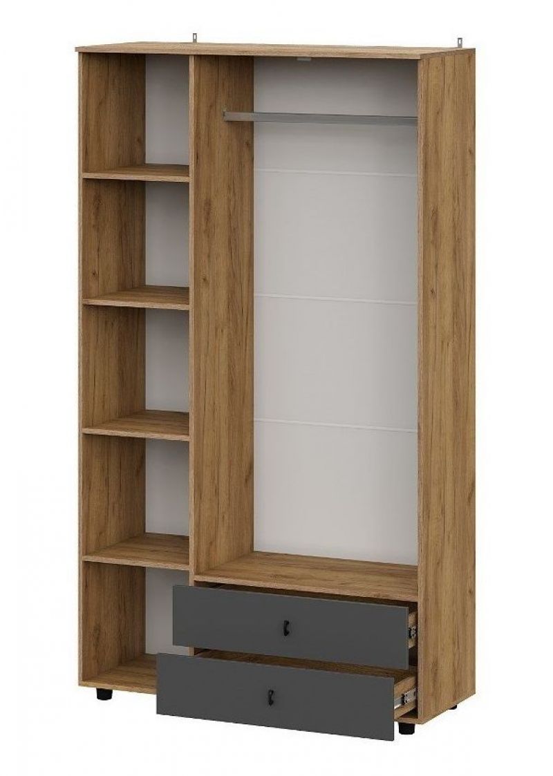 В левой части шкафа расположен отсек с четырьмя полками (одна стационарная и три съемных), в правой части шкафа расположен отсек со штангой (присадка под штангу отсутствует, покупатель устанавливает ее самостоятельно), под которым установлены два выкатных ящика.