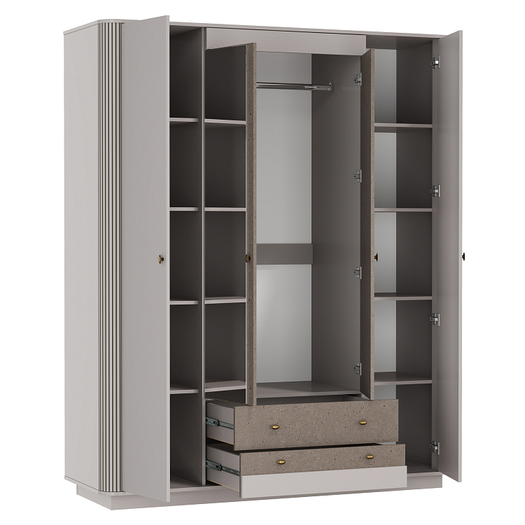 Шкаф для одежды 34.01 Фантазия (4-х дв.) (кашемир / дуо / ДВПО: белый / профиль: Kroning кашемир патина №30.1) совмещает благородную привлекательную эстетику с практичностью и хорошим функционалом. Продуманный дизайн уместно дополнит созданный интерьер и органично впишется в любое помещение.